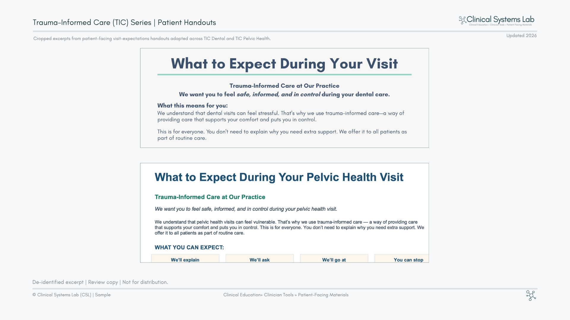 TIC Series is a practical education and support system built to help clinicians and teams apply trauma-informed care more clearly and consistently in practice. The series combines education, clinician-facing tools, patient-facing materials, and implementation supports to make trauma-informed care more usable in day-to-day settings. Current applications include pelvic health and dentistry, with flexibility for additional clinical contexts over time.